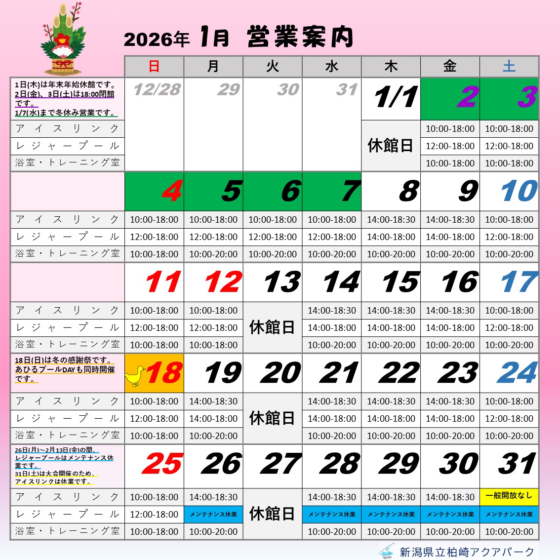 ※例外で長水路の日に短水路、また短水路の日に長水路となる場合がございます。